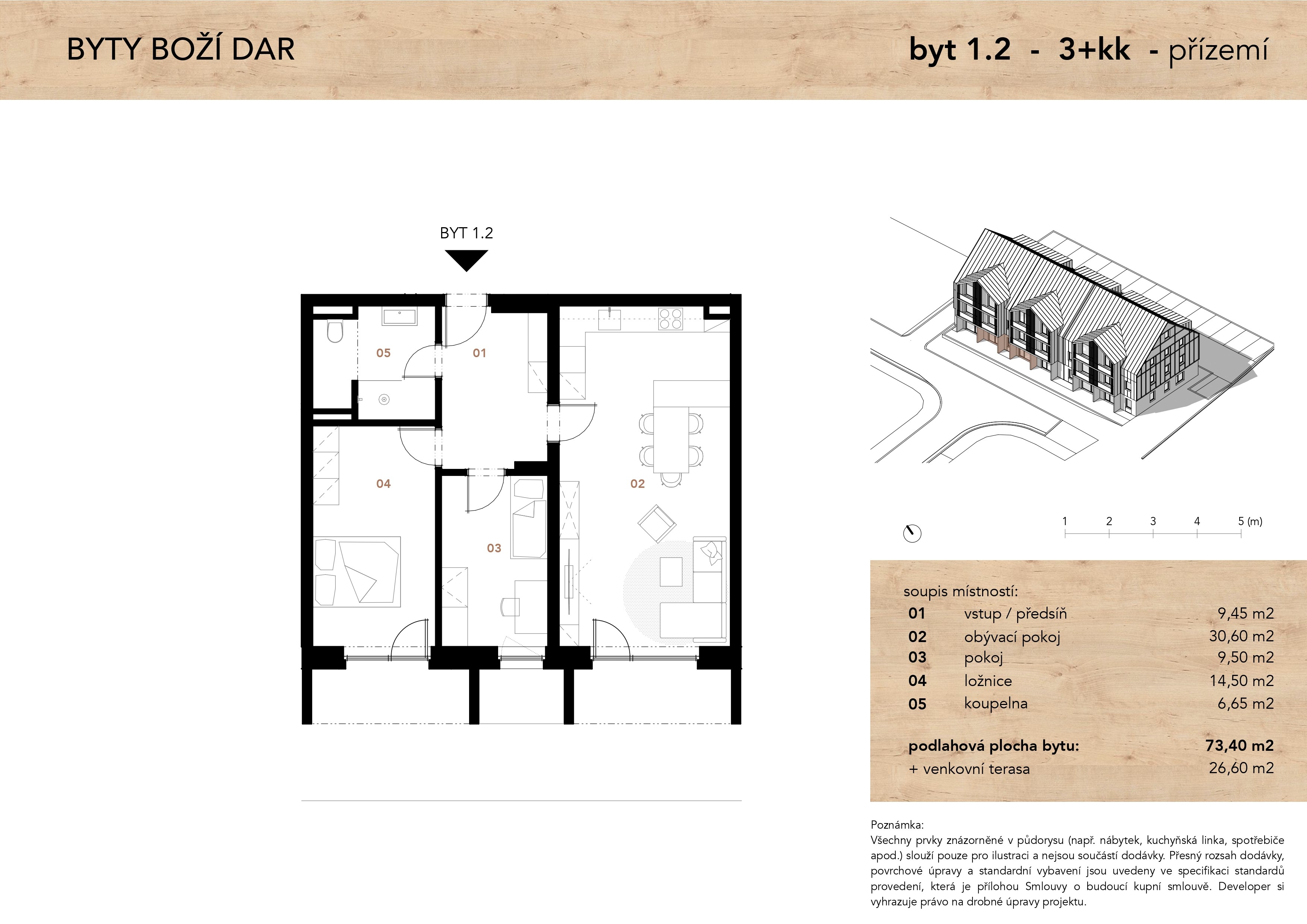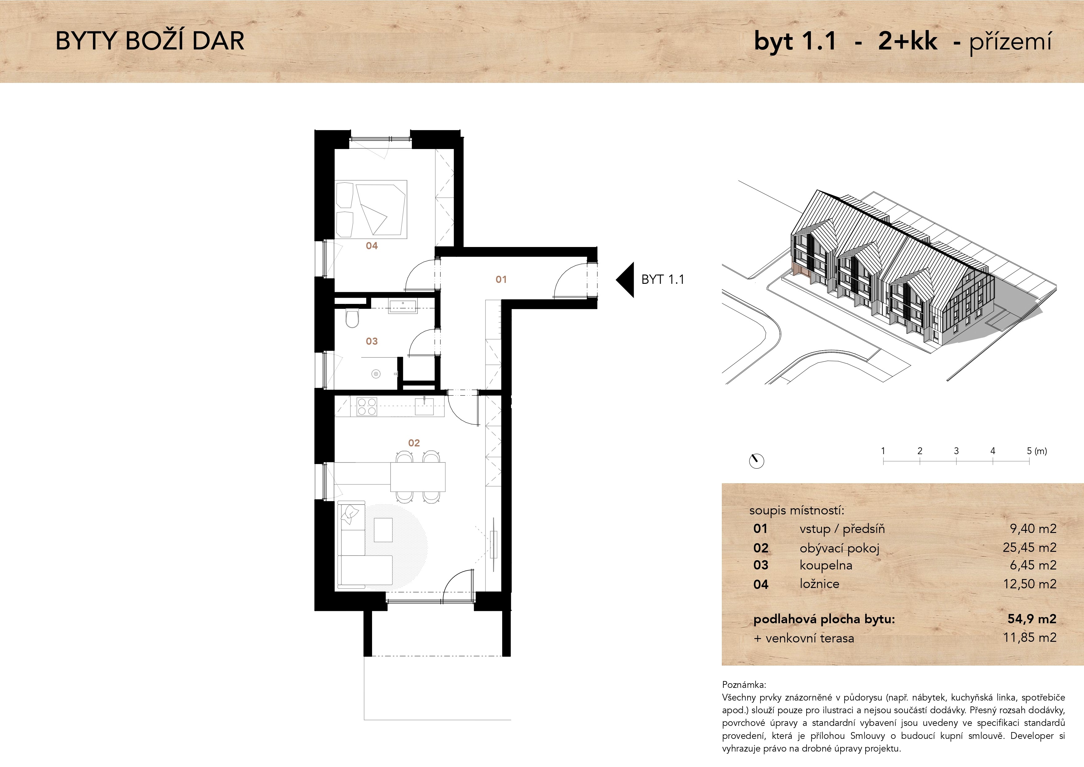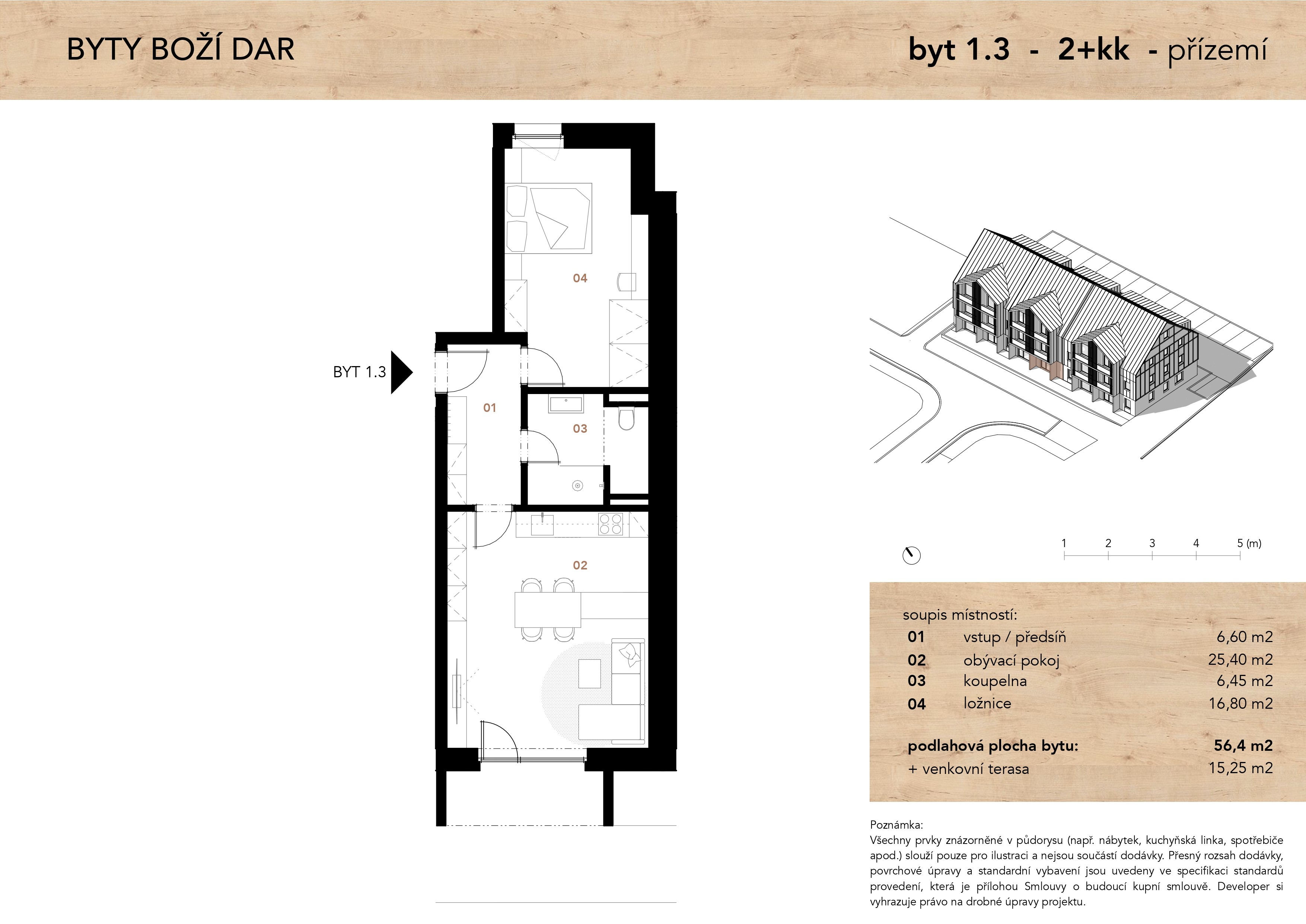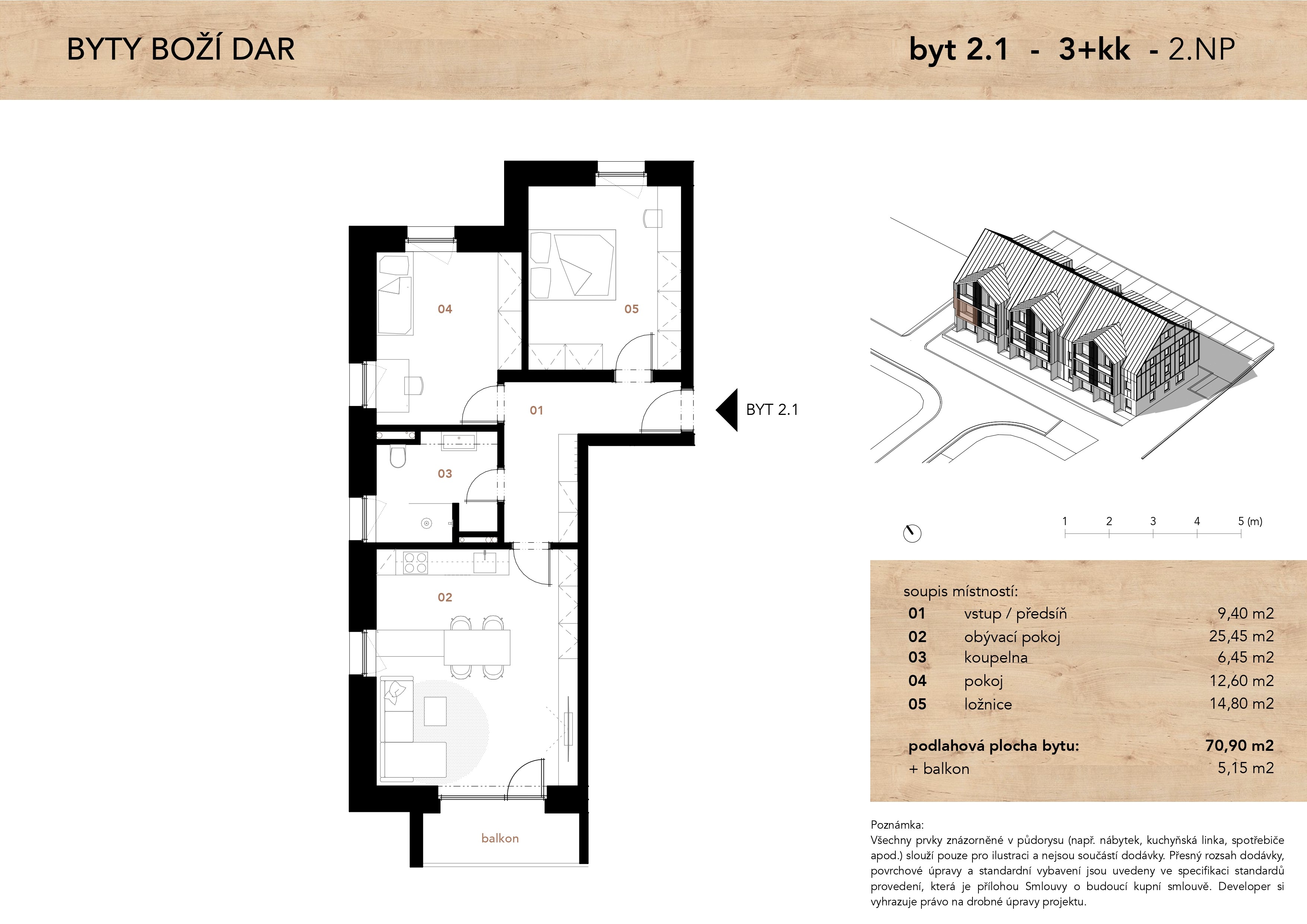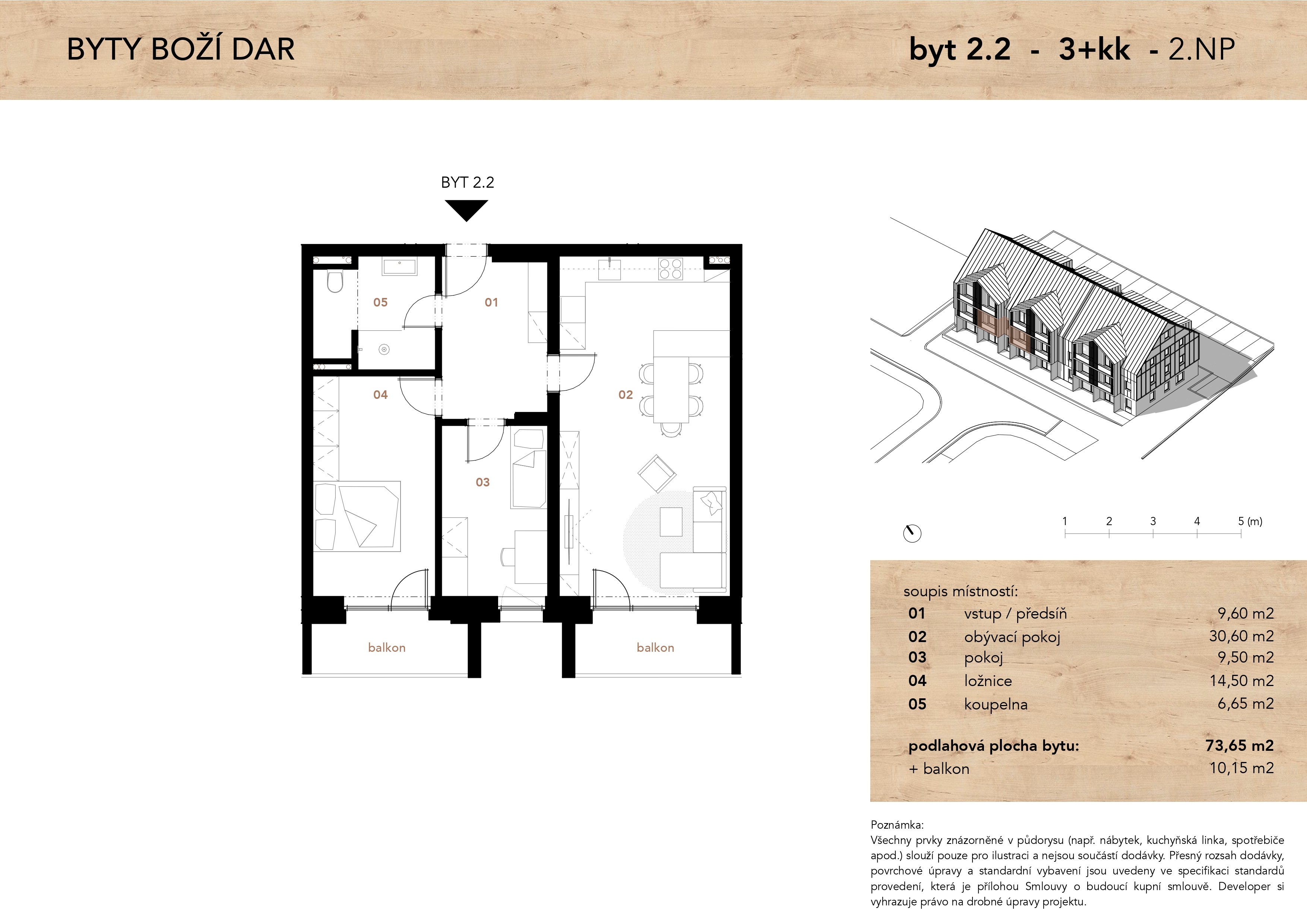 Bytový dům je navržen jako moderní rezidenční objekt horského typu o celkovém počtu 18 bytových jednotek, dispozičně řešených ve variantách 2+kk, 3+kk a jedním bytem 4+kk. Přízemní byty jsou koncipovány s vlastními terasami, které přirozeně propojují interiér s okolní krajinou. Každá jednotka disponuje vyhrazeným parkovacím stáním a sklepní kójí, zajišťující dostatek úložného prostoru. Architektonické řešení vychází z horského charakteru lokality - design kombinuje moderní prvky s přírodními materiály a vytváří tak bydlení, které je funkční, estetické a respektuje své prostředí.