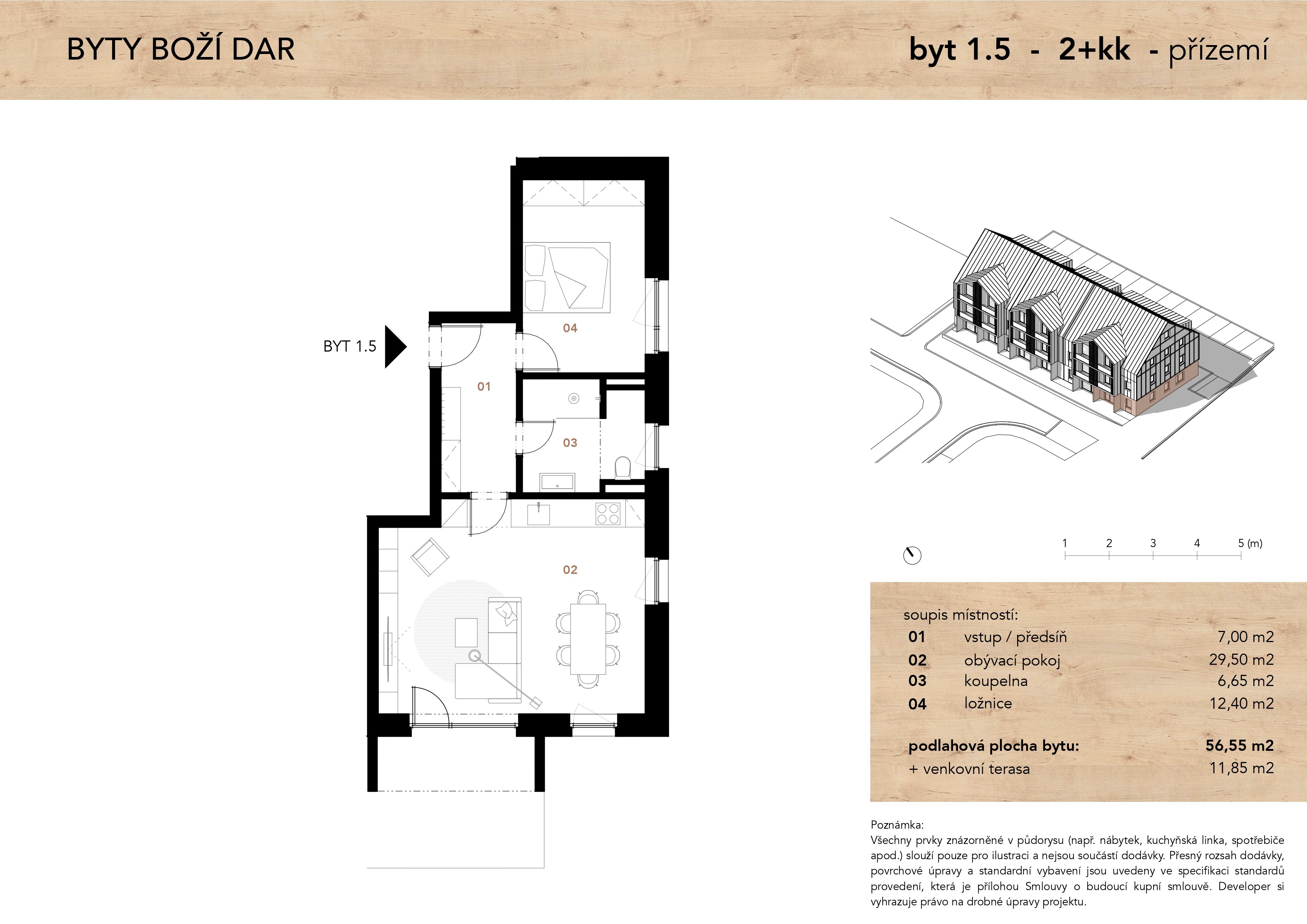 Vsechny prvky znázornēné v púdorysu (napĩ. nábytek, kuchyñská linka, spotrebice apod.) slouzí pouze pro ilustraci a nejsou soucástí dodávky. Presný rozsah dodávky, povrchové úpravy a standardní vybavení jsou uvedeny ve specifikaci standardú provedení, která je prílohou Smlouvy o budoucí kupní smlouve. Developer si vyhrazuje právo na drobné úpravy projektu.