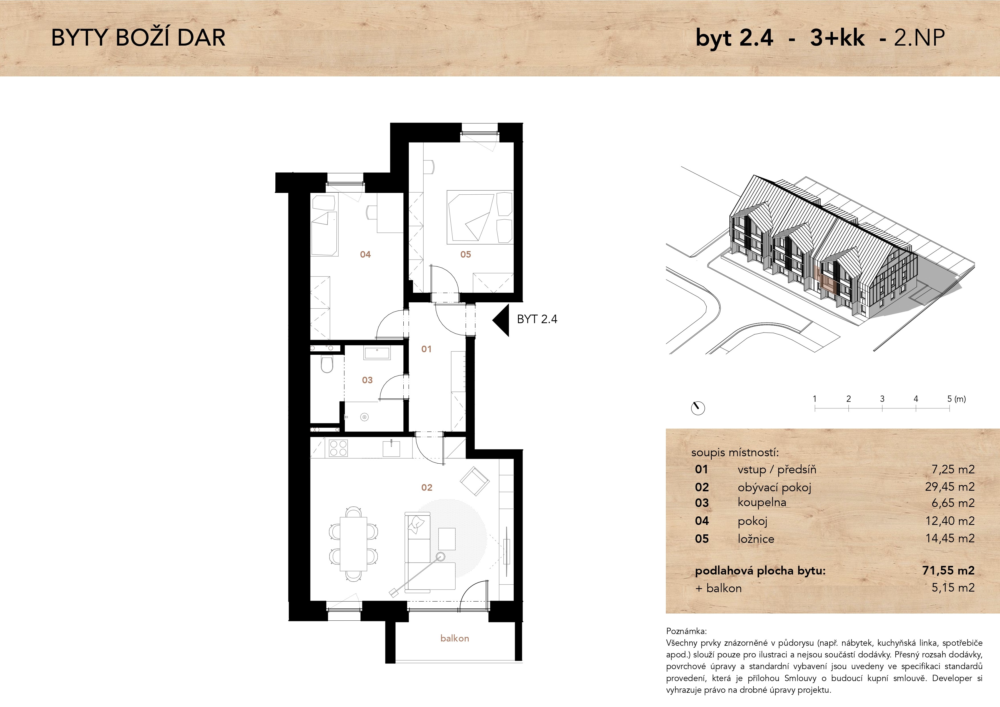Vsechny prvky znázornēné v púdorysu (napĩ. nábytek, kuchyñská linka, spotrebice apod.) slouzí pouze pro ilustraci a nejsou soucástí dodávky. Presný rozsah dodávky, povrchové úpravy a standardní vybavení jsou uvedeny ve specifikaci standardú provedení, která je prílohou Smlouvy o budoucí kupní smlouve. Developer si vyhrazuje právo na drobné úpravy projektu.